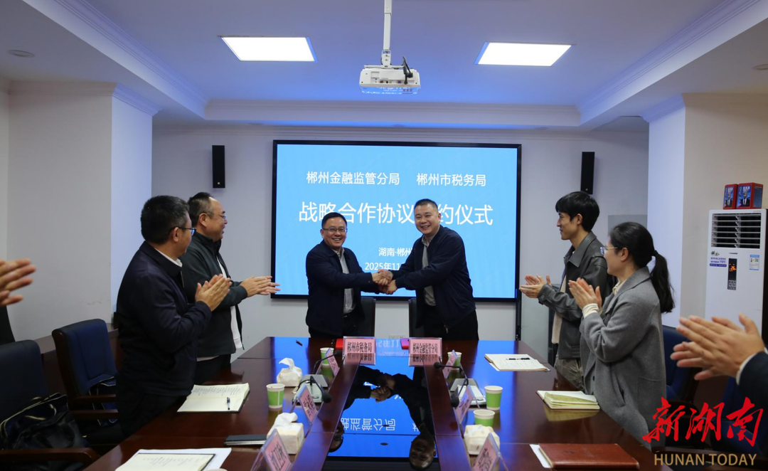 华声在线11月13日讯(通讯员 李芳杰)11月12日,国家税务总局郴州市税务局与国家金融监督管理总局郴州监管分局签订战略合作协议。两部门将围绕共夯征管基础、共强协同监管、共优服务协作、共研成果互鉴等方面达成深度合作,以跨部门联动打通服务壁垒,为郴州金融行业高质量发展注入新动能。