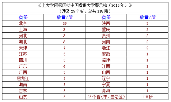 《第四批中国虚假大学警示榜》显示,118所虚假大学涉及25个省市,其中北京市最多,有39所,上海、河北、湖北也各有8所。