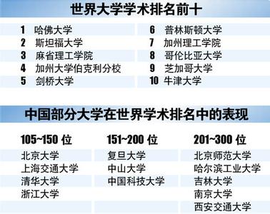 2015年“世界大学学术排名”结果显示:美英大学的优势仍然非常明显,哈佛大学连续十三年蝉联全球第一,斯坦福大学、麻省理工学院、加州大学伯克利分校、剑桥大学、普林斯顿大学、加州理工学院、哥伦比亚大学、芝加哥大学和牛津大学分别位列第二至第十名。