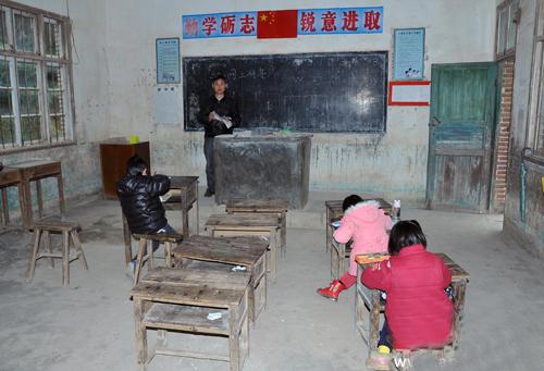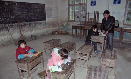 1月12日, 寒风冷雨, 冻得手脚麻木。从县城驱车2个多小时来到地处安仁县偏远高山区的革命老区村——潭湾村小学,看到赖忠秀老师正在和学生认真上课。虽然教室里没有灯泡,课桌陈旧,但教室内的张贴的课程表等很规范。