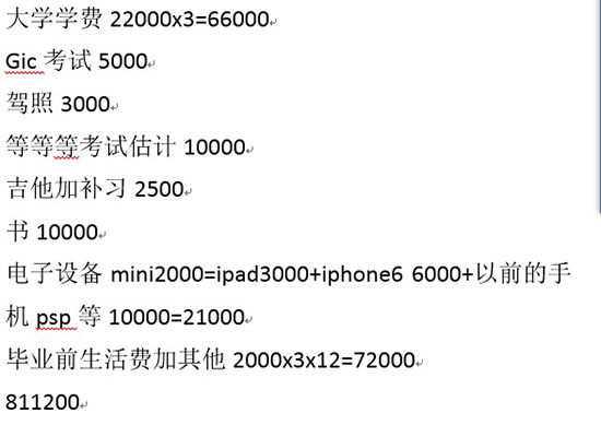 “我已经花了30万”“我43万了”…… 武汉工程科技学院大学生通讯社的新生群炸开了锅,该校国际贸易专业的余睿表示,抛开面上的数字,其实父母对我们的付出不仅局限在金钱上,人格的培养、思想 的教育等等,都是无法偿还的“帐”。测绘专业的周一鸣则告诉记者,他要求父母一起算账,父母却表示这笔账出自于爱,无需算更无须偿还。他说:“尽管父母不 要求我‘还债’,但我以后一定要尽我所能,让父母过上富足的生活。”