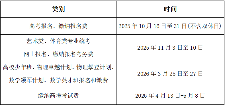 特别注意:高考报名信息采集工作须在2025年10月16日至31日(不含双休日)进行,所有考生必须在上述规定时段内完成高考报名信息填报与确认,缴纳相关费用并确认缴费成功,逾期不再受理,也不安排高考补报名