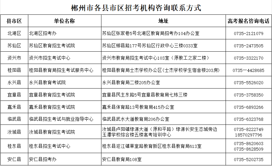 1.请考生和家长实时关注“湖南考试招生”、“郴州教育发布”微信公众号和湖南省教育考试院官网“湖南招生考试信息港”,及时了解并掌握与高考相关的信息。