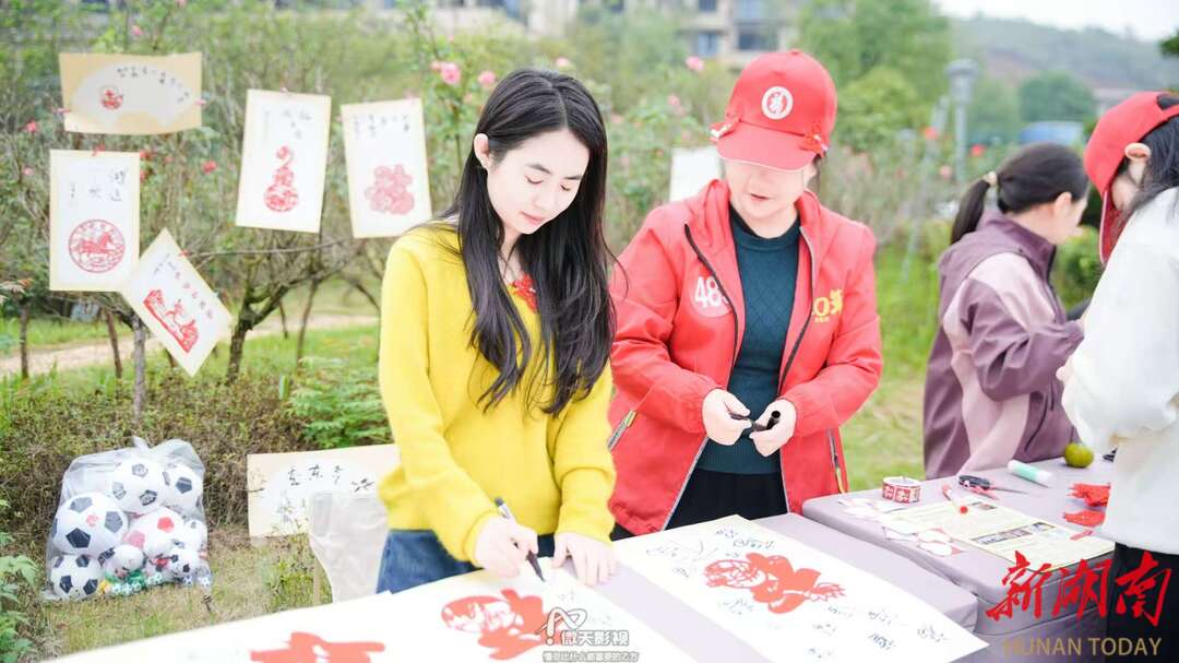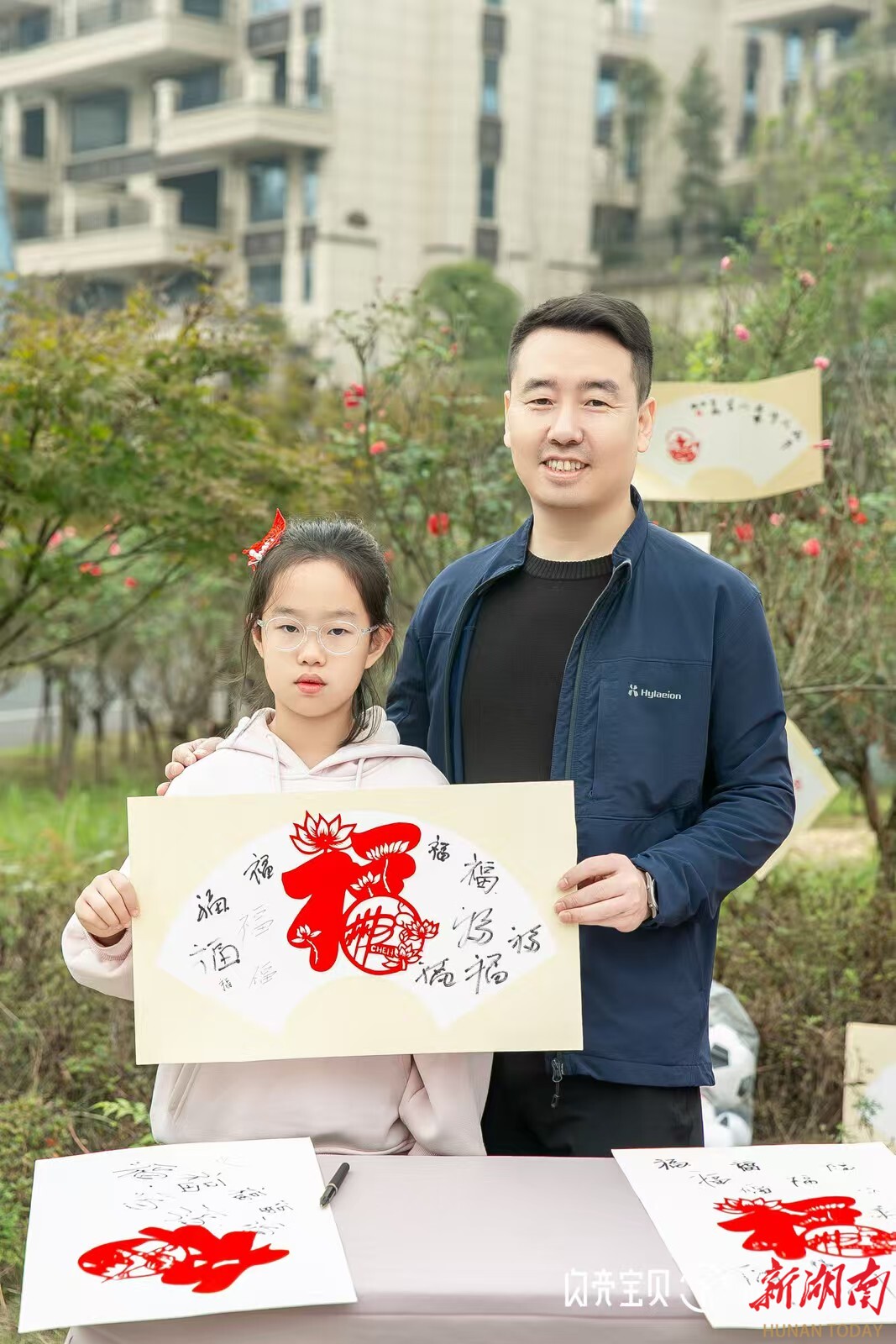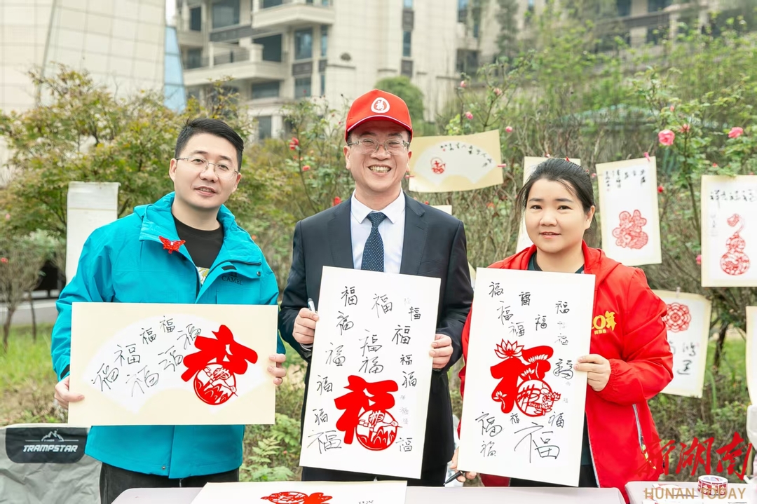 郴州市第三代剪绣非遗传承人李红梅到场助力,带来特色非遗体验环节。她为参与者准备了蝴蝶(福)戒指、发夹、胸针等剪绣手工材料包,并提供福剪纸作品,邀请名家书写“百福”,让传统技艺在互动中传递福气。