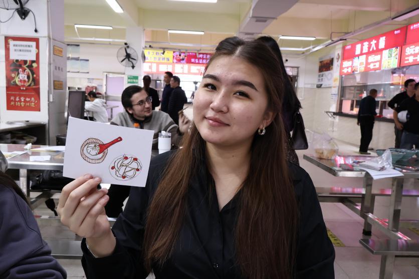活动中,非遗擂辣椒教学成为文化深度沟通的核心环节。文学与新闻学院大一学生何斯盛介绍擂辣椒的起源与民俗文化,并现场指导留学生动手制作擂辣椒。留学生们手持擂杵认真捣制,跟着中国学生学说中文“擂辣椒,下饭”,生疏却认真的发音引得现场欢笑不断。随后,留学生们一起动手画米饺,在便签上写下“米饺好吃”“郴州好”等内容,来自也门的留学生阿海兴奋地说:“一定要发给家人看看!”