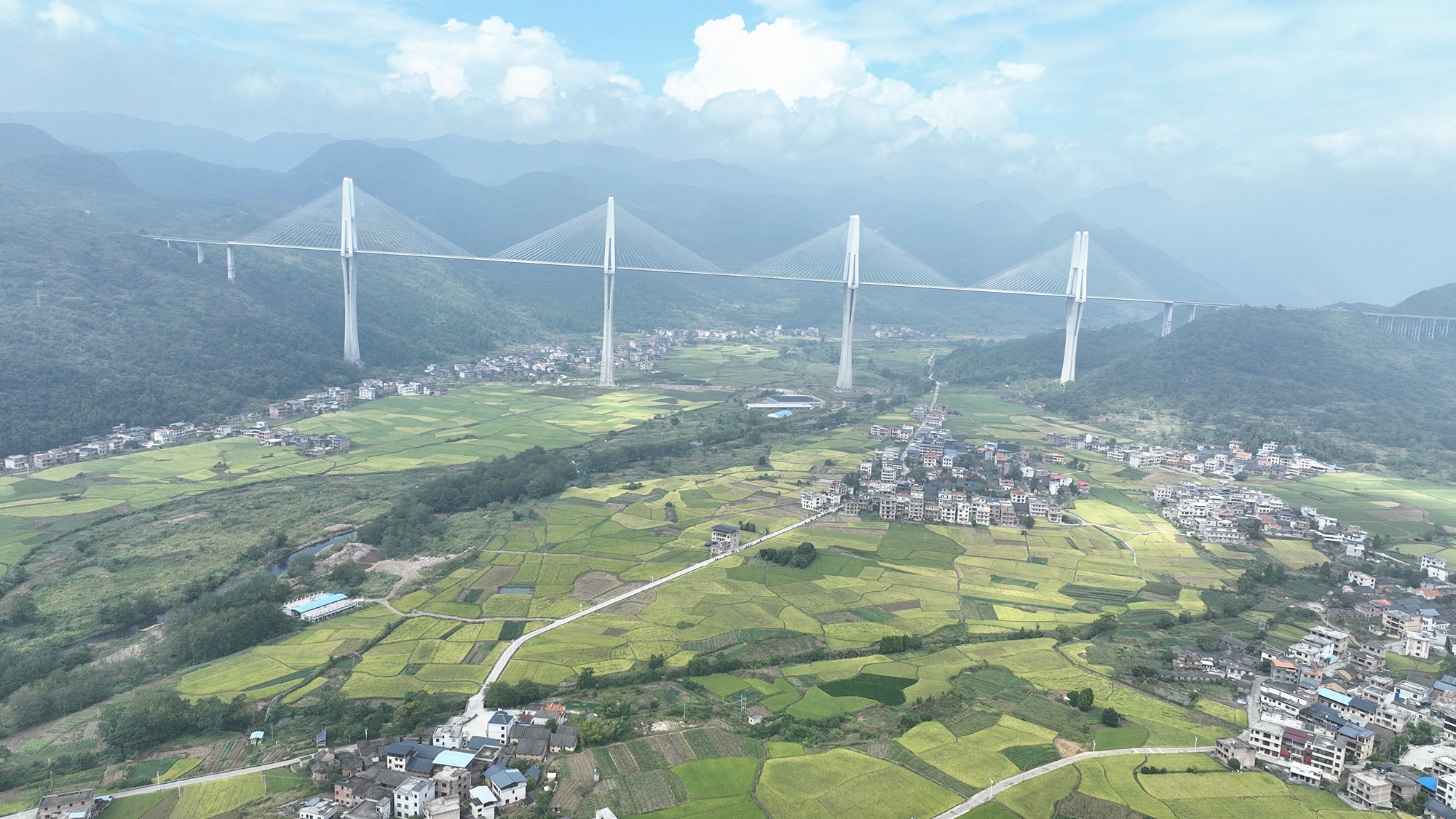 高空俯瞰,千亩稻田好似被大自然打翻的调色盘,青绿的生机与金黄的成熟相互交融,色彩浓郁却又不失和谐,流动的色块在田野间肆意铺展。稻田周边,连绵的山峦被浓密的植被覆盖,墨绿的色彩浓郁而厚重,与田野间的青黄形成鲜明对比,一刚一柔、一深一浅。远处,赤石大桥巍峨耸立,在蓝天白云与山水田园的映衬下,尽显大气磅礴;近处,村庄房屋错落有致,白墙黛瓦与周边景致融为一体,屋前的老树枝桠间,白鹭正在枝头休憩,偶尔发出清脆的鸣叫声,勾勒出一幅有声有色、层次分明的秋日田园画卷。