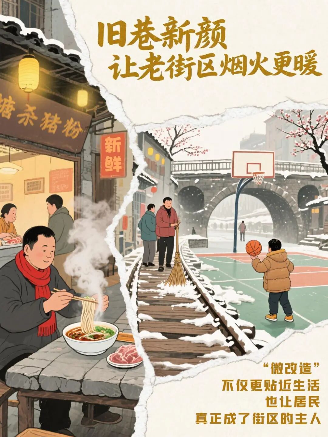 “微改造”不仅更贴近生活,也让居民真正成了街区的主人。行走在郴州的大街小巷,记者看见不少当地居民主动拿起扫帚清扫步道,孩子在防风棚里追逐嬉戏,这些充满烟火气的老街区,让老地方留住了乡愁,更让雪天的城市多了几分温暖。