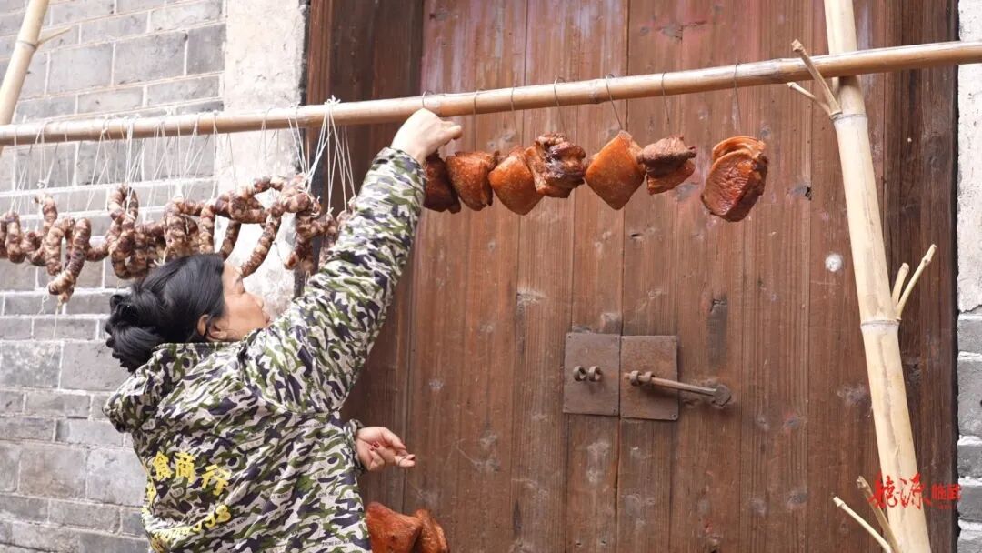 刚出锅的油炸肉,金黄透亮,外酥里嫩。挂起来风干,能从腊月存到正月。在当地,它也叫“走油肉”“过年肉”,可蒸可煮,能做梅菜扣肉,也能煮汤提鲜。这天忙完,胡国英就用刚炸好的肉炒了几道菜,一家人围坐桌前,举杯动筷,说说笑笑。