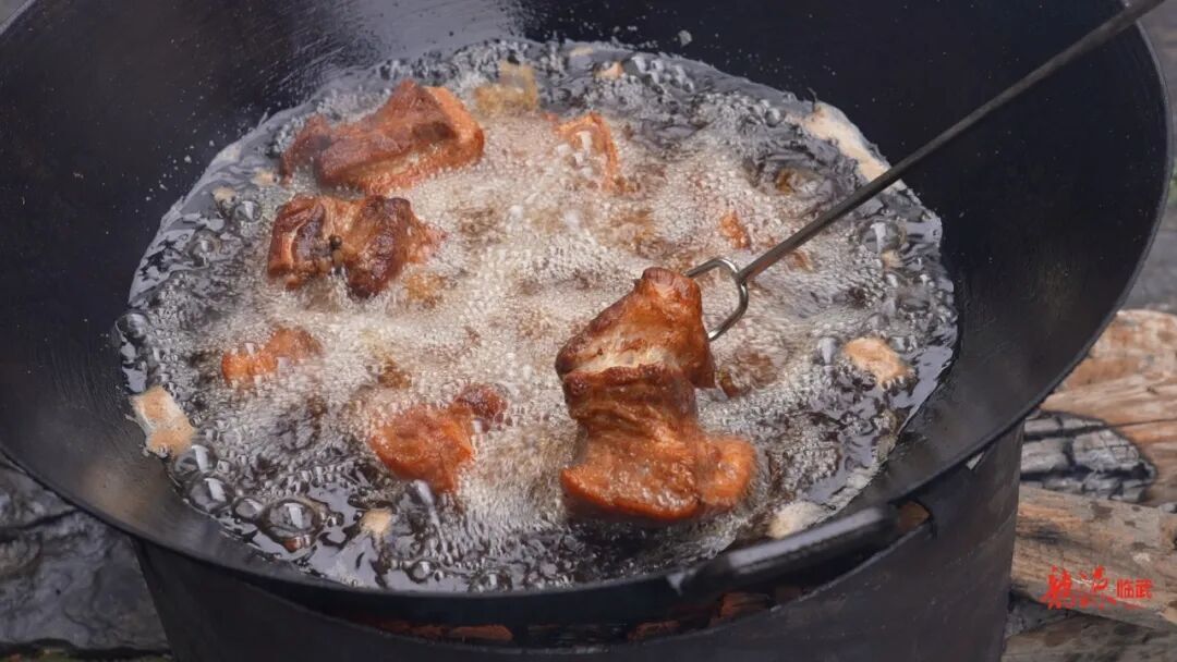 胡建林负责掌控火候,中火稳烧,油温八成热时,胡国英便将切好的肉块沿锅边滑入。滋啦一声,热气腾起,金黄的油花轻轻翻动,香气瞬间弥漫整个屋子。