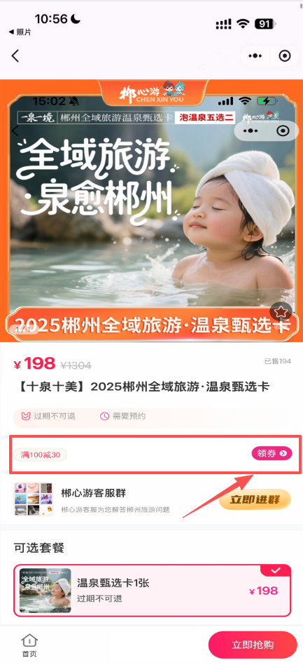 下单:在“十泉十美” 活动页面选择心仪的温泉产品或线路,在商品详情中领取优惠券后下单时,消费券将自动抵扣优惠金额。