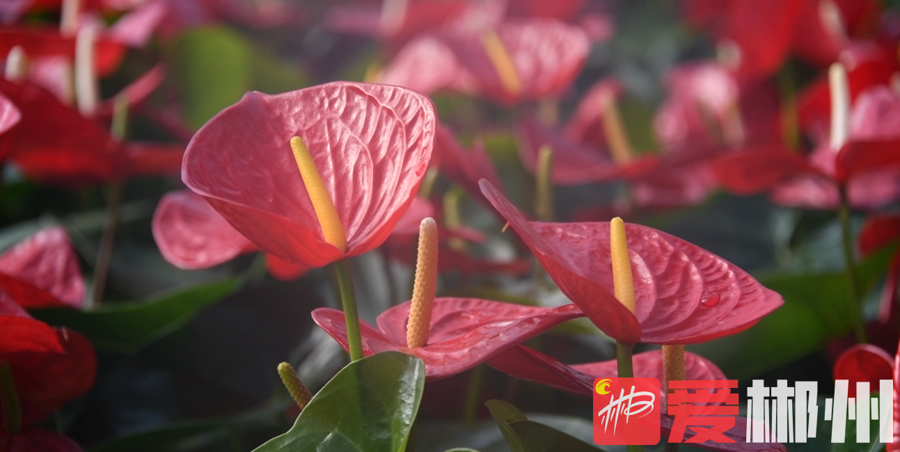 火红喜庆的红掌花卉在温室内争奇斗艳,生机勃勃。(通讯员供图)