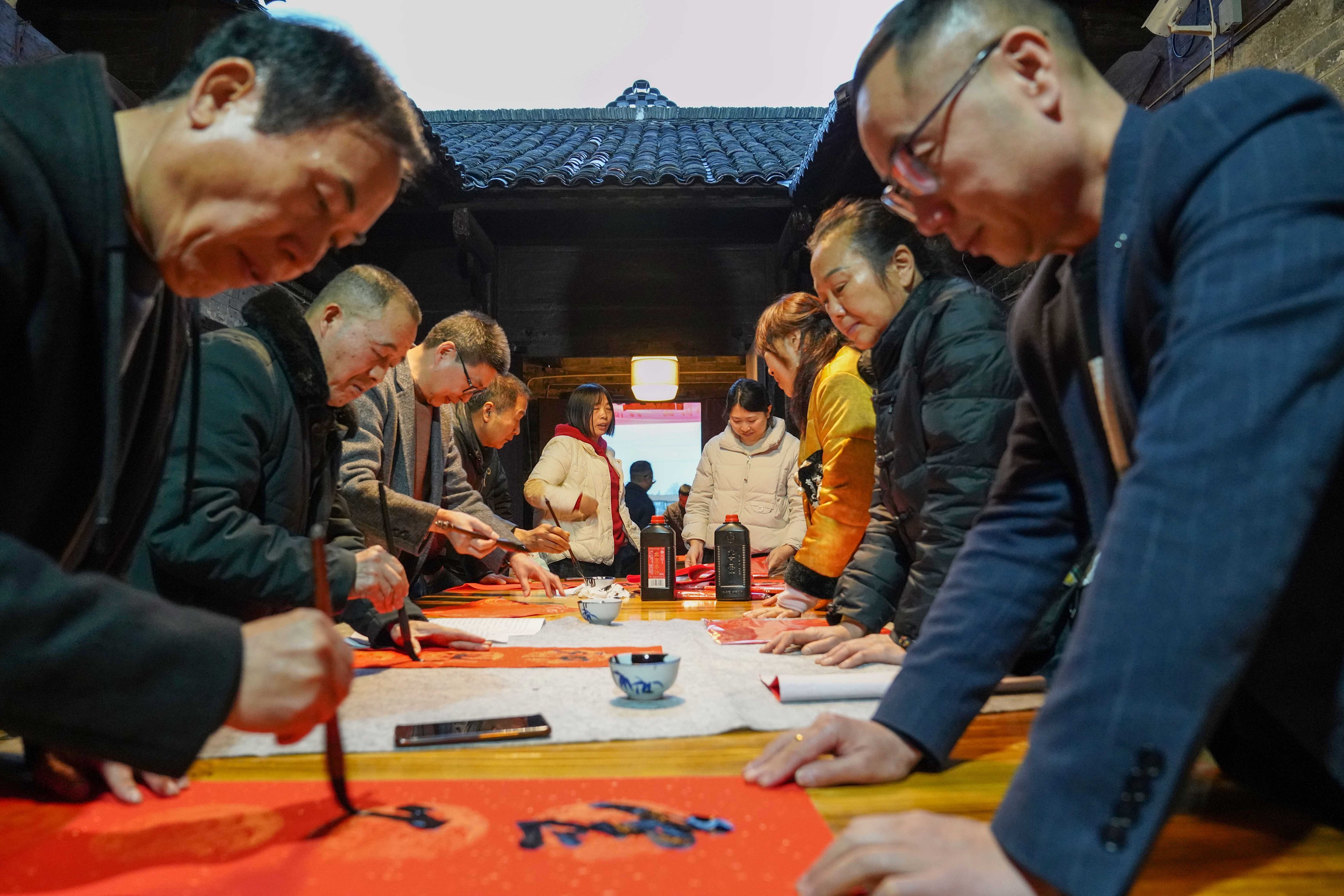 2月6日,资兴市三都镇流华湾景区辰岗岭古村,书法老师在免费写春联。 当天,资兴市文学艺术界联合会、资兴市书法家协会、资兴市老年书画协会、东江湖摄影艺术馆联合开展“光影迎新春”文化志愿服务暨“万福迎春”进基层公益活动。活动现场,书法老师们挥毫泼墨,书写春联、福字等作品,为群众送上新春祝福。