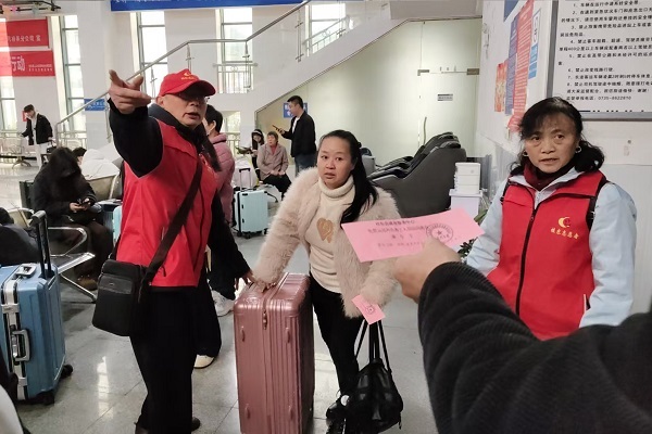 志愿者张凤珠还记得,2月24日大雨倾盆,天还没亮,她就赶到了车站。看到一位务工人员拖着两大箱行李,还牵着年幼的孩子。她立马上前帮忙搬行李、扶着母子坐下。一句简单又真诚的“谢谢”,让她觉得再冷再累都值得。