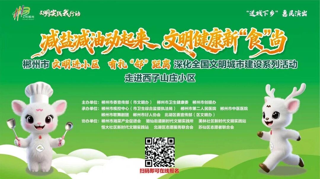 郴州市“文明进小区 有礼‘邻’距离”系列活动重磅走进西子山庄小区,减盐减油科普、健康服务、趣味互动一站式打卡,扫码即可报名参与,邀你解锁文明生活新 “食” 尚。
